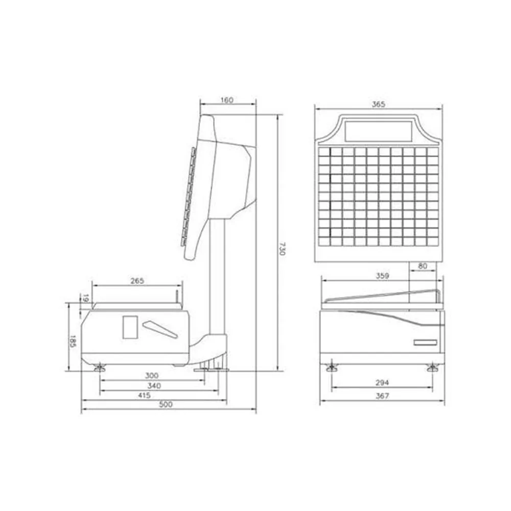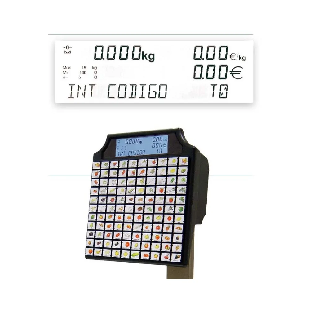 Pantalla de indicación LCD Retroiluminada de tres líneas, las dos primeras son numéricas y la tercera alfanumérica para descriptivos de artículos y menús. Indicación de peso, precio e importe, visualización de tara, indicadores de cero, estabilidad, etc.
