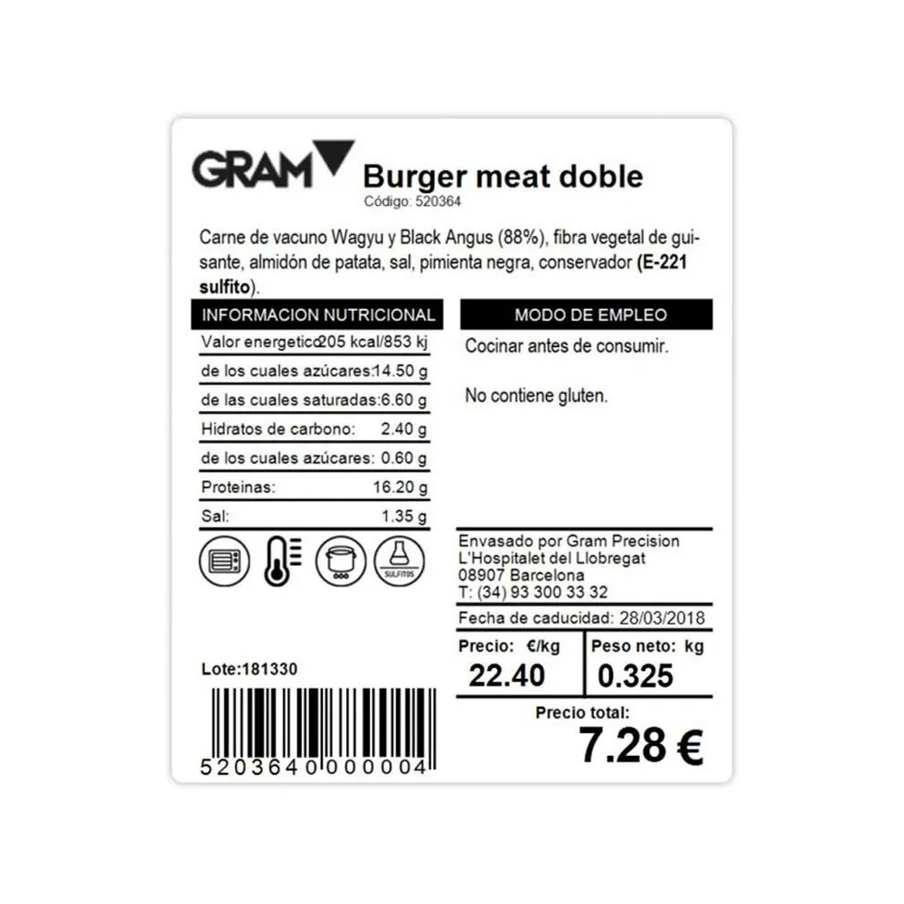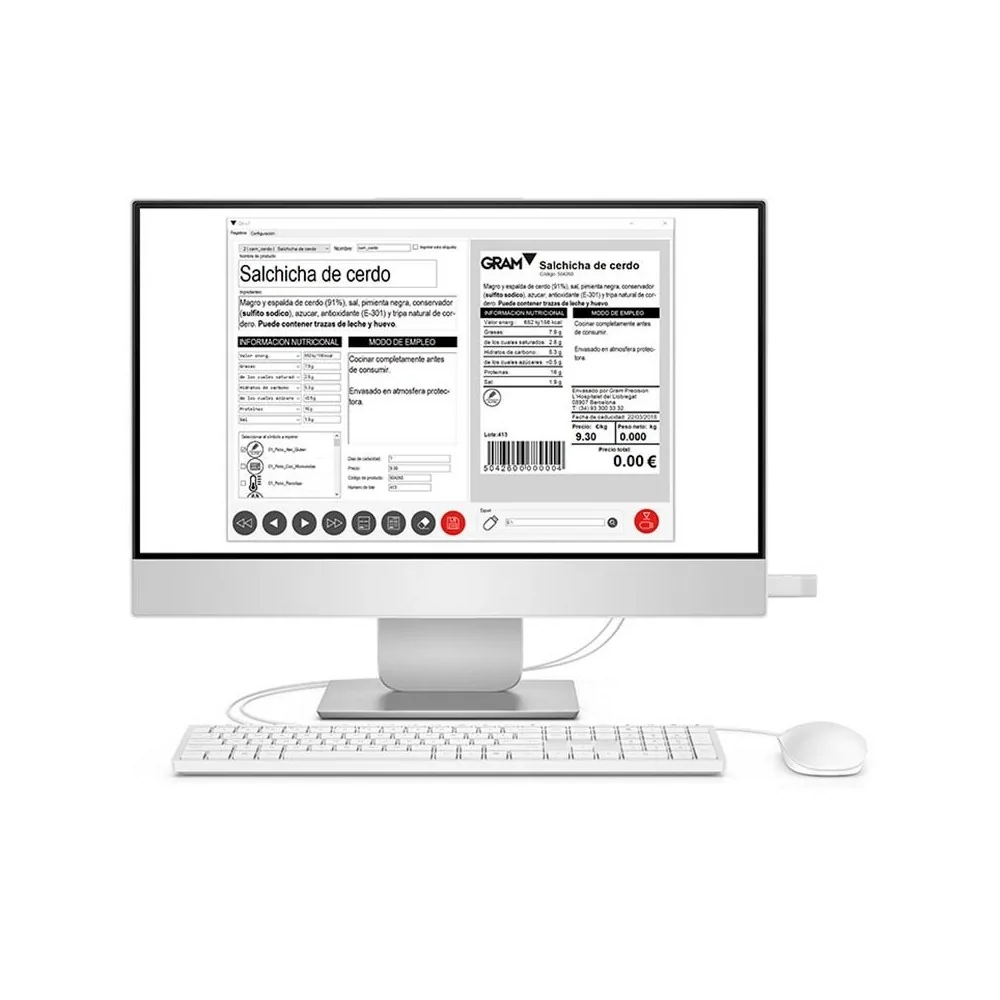 Permite el etiquetado de alimentos según reglamento UE1169/2011, UE 1155/2013, UE78/2014, UE1337/2013 y UE828/014. Incluye todos los datos obligatorios según normativa actual: ingredientes, alérgenos, información nutricional, recomendaciones de conservación, datos empresa envasado, trazabilidad de la carne, tipo de envasado, fecha caducidad, precio/kilo, peso, precio total, además de símbolos, logotipo y código de barras.