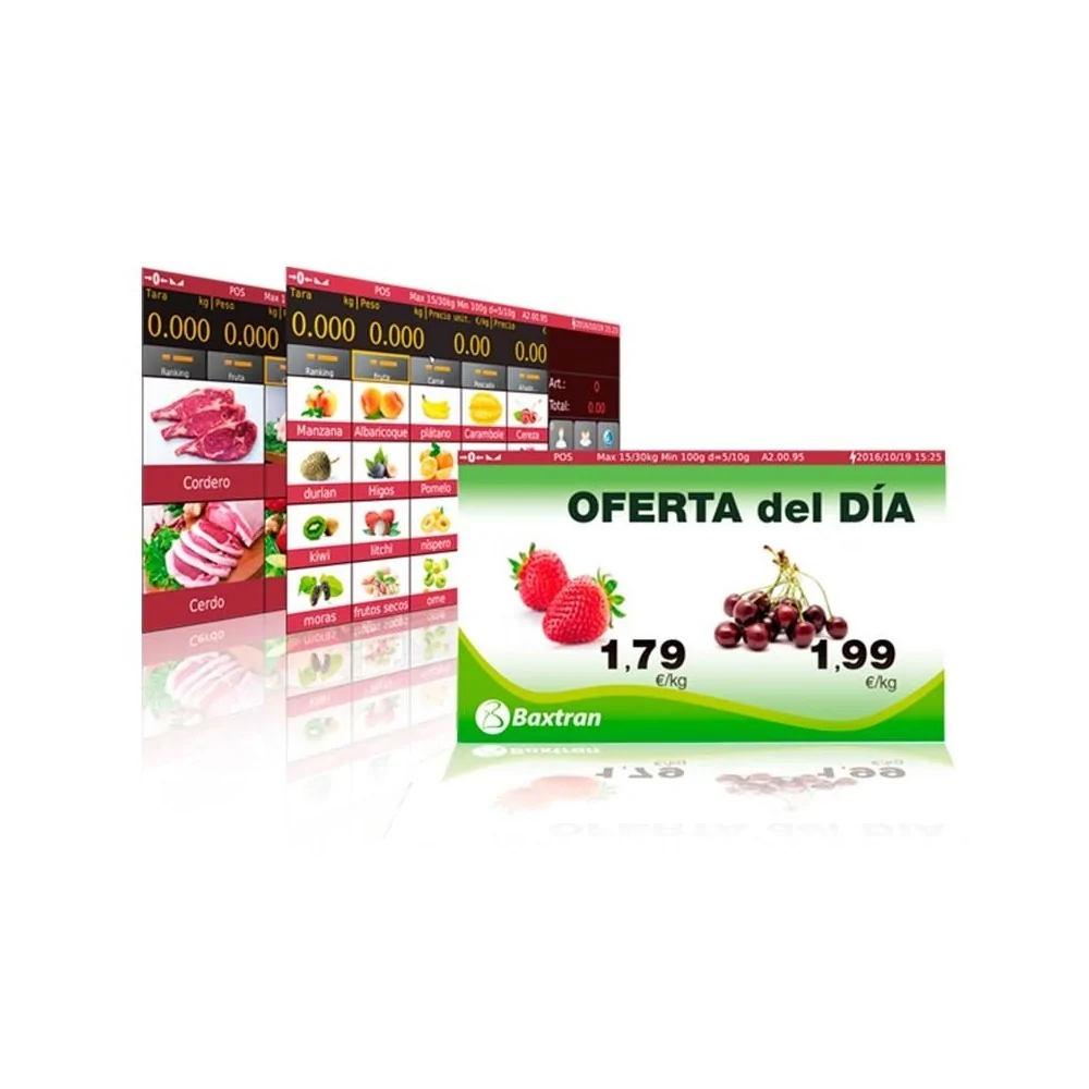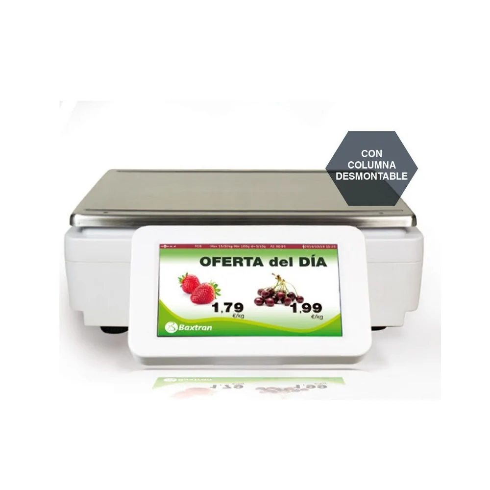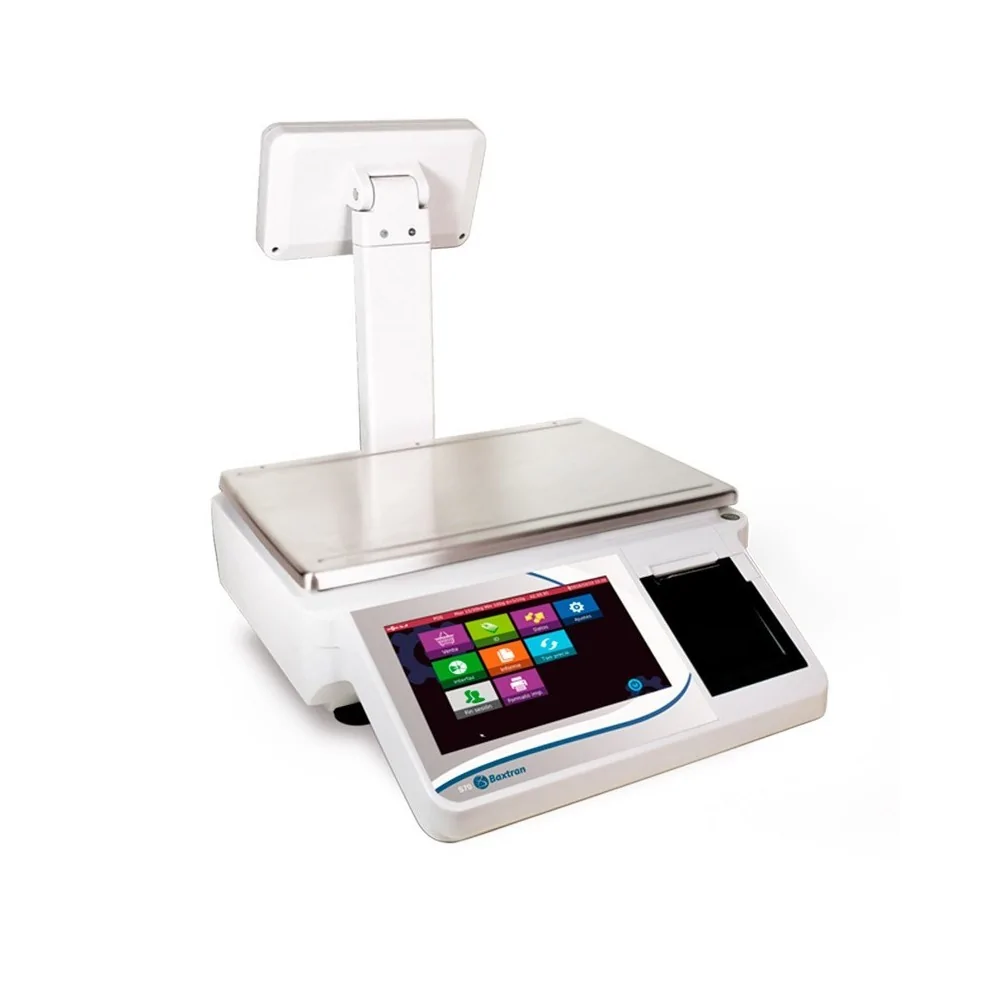 La balanza comercial Baxtran S70, de alta gama, cabe destacar las dos pantallas, su funcionamiento intuitivo, gran capacidad de memoria de artículos y su alta velocidad de impresión.