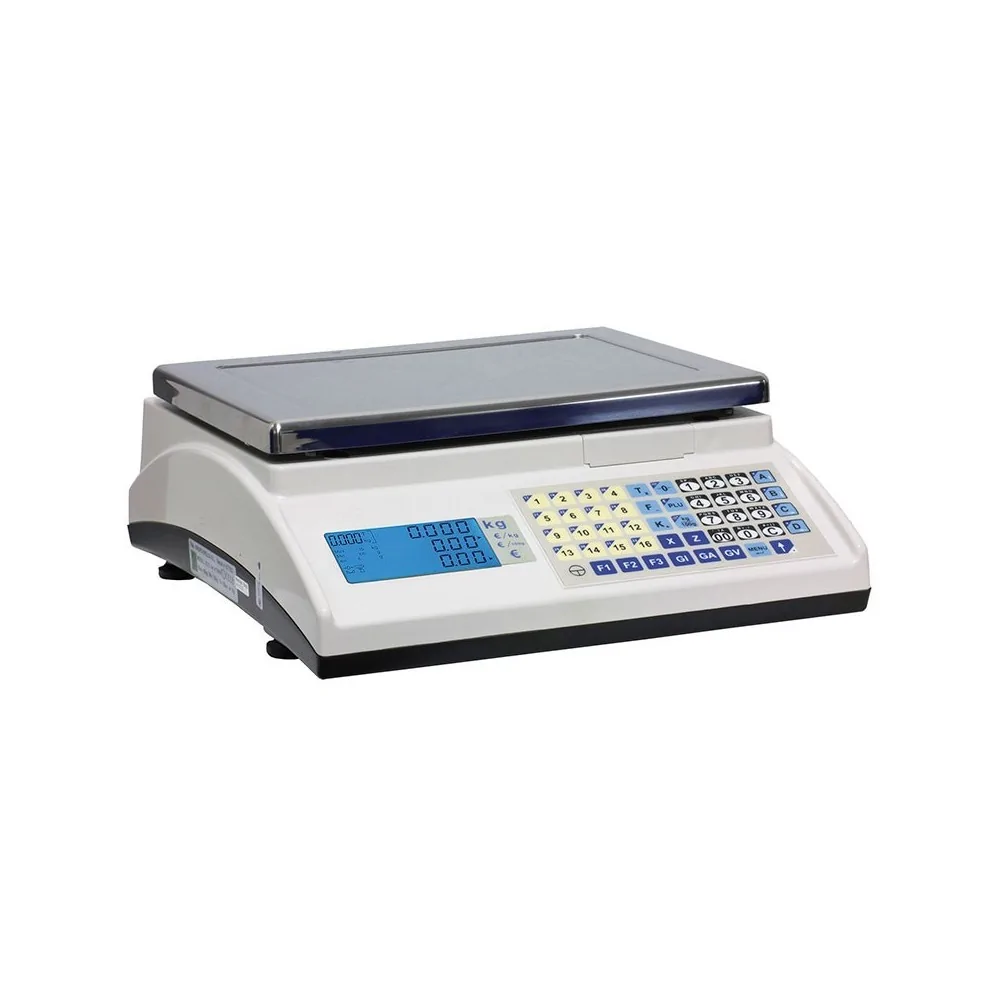 Display comprador y vendedor. Teclado de recorrido mecánico con tecla tipo cherry. Más de 25 protocolos distintos para conexión con ordenador / TPV. Envío de peso. 100 PLU´s y 16 x 2 teclas directas
