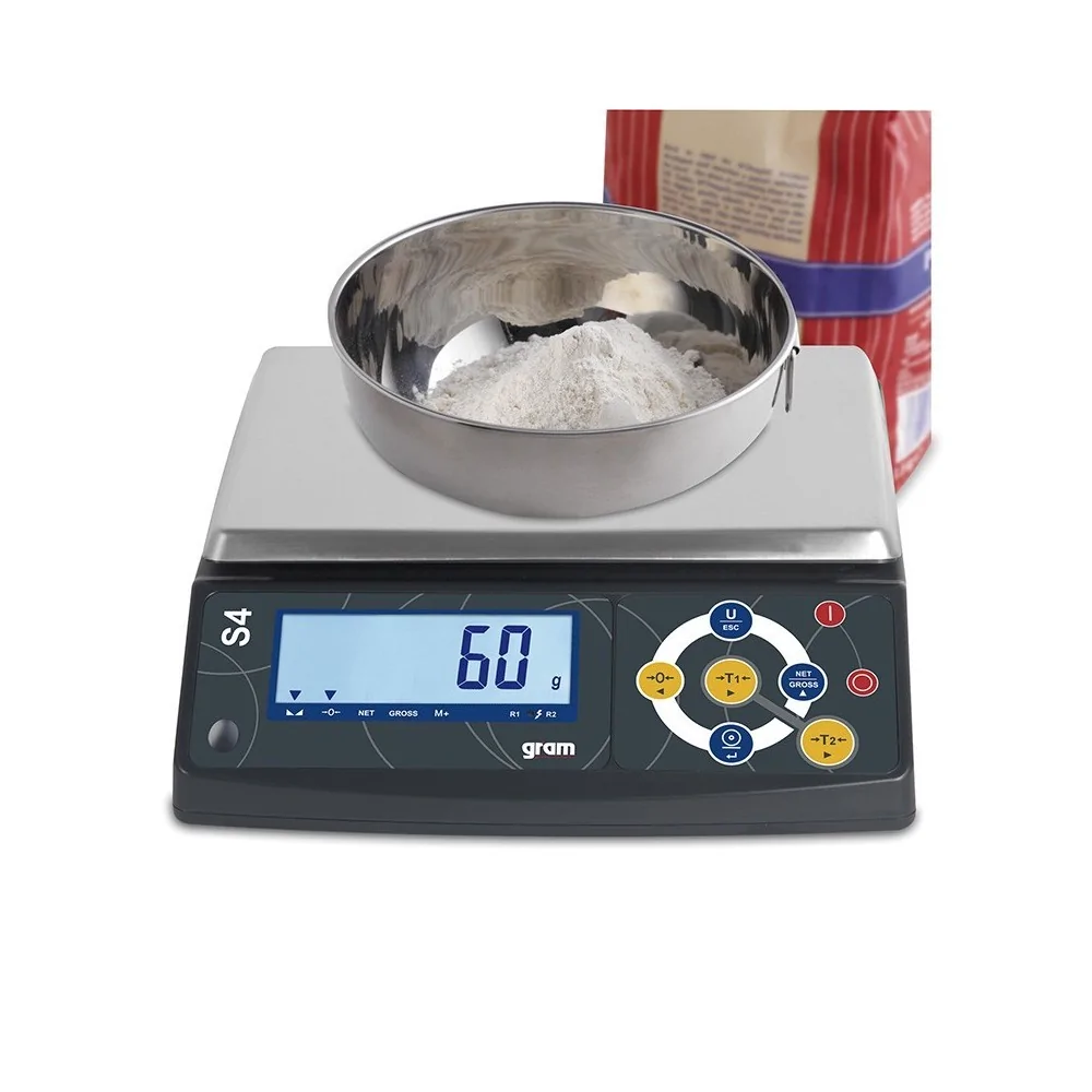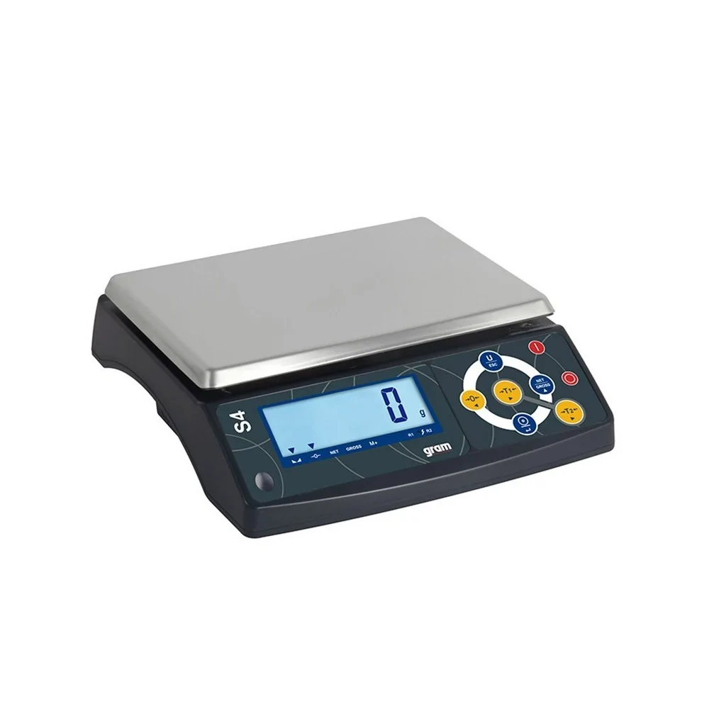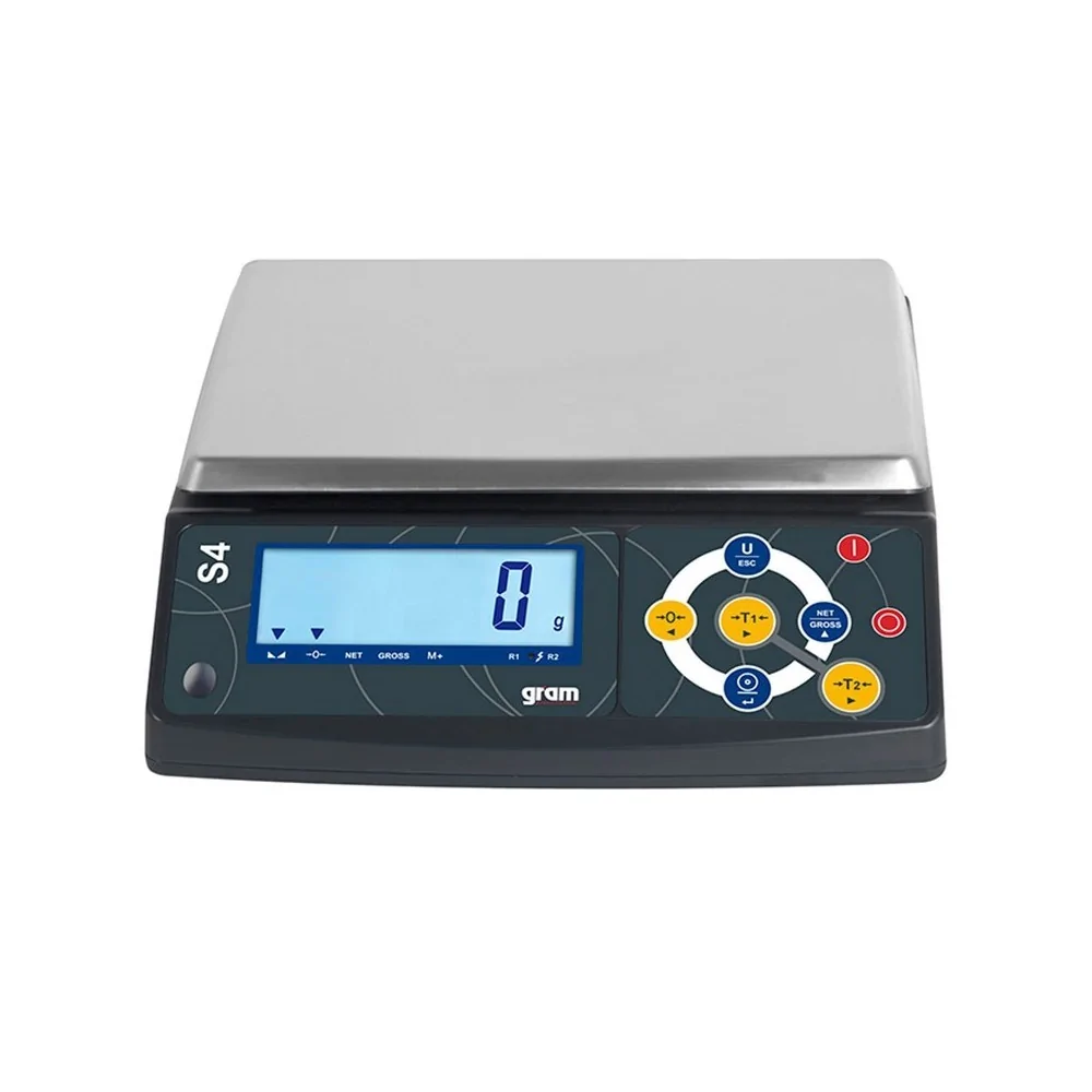 La báscula de precisión Gram S4, viene de serie certificada y con salida RS232, para pc e impresora, disponible en 3 capacidades, 6 Kh, 15 Kg y 30 Kg