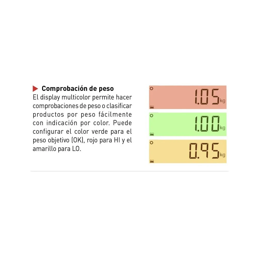 • Clasificación o comprobación por peso con visualización en 3 vivos colores.