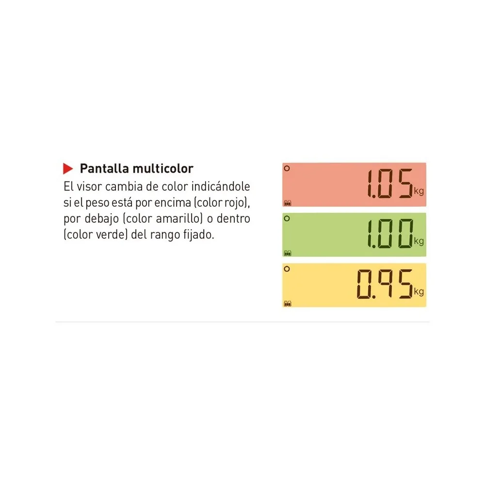• Clasificación o comprobación por peso con visualización en 3 vivos colores.