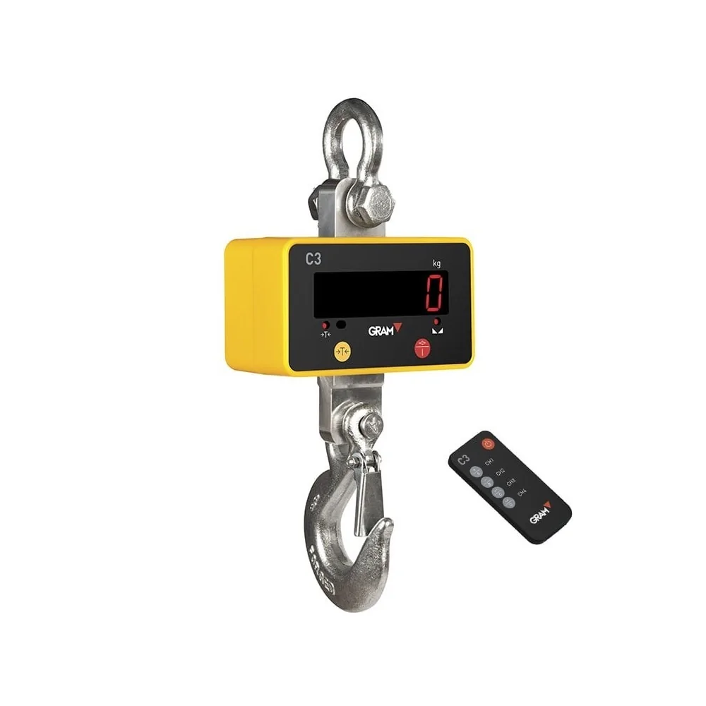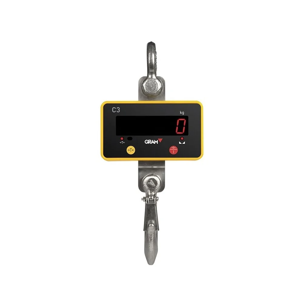 El gancho Gram C3 es un gancho para pesadas aéreas, con un display led rojo de alto contraste, de gran tamaño 21 mm. Posee un gancho de acero muy resistente, capaz de soportar grandes cargas. Disponible en 3 versiones 300, 500 y 1000 Kg.