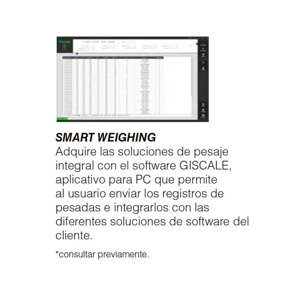 Software GISCALE(opcional), permite una mayor productividad en la planta, garantizando que la transpaleta transporte cada carga dentro de los límites de seguridad y registre todas las cargas automáticamente para una mejor gestión y control de la producción, logística de stock, entre otras. Los usuarios podrán adquirir soluciones de pesaje integral y enviar registros de pesadas e integrarlos con las diferentes soluciones de software del cliente.