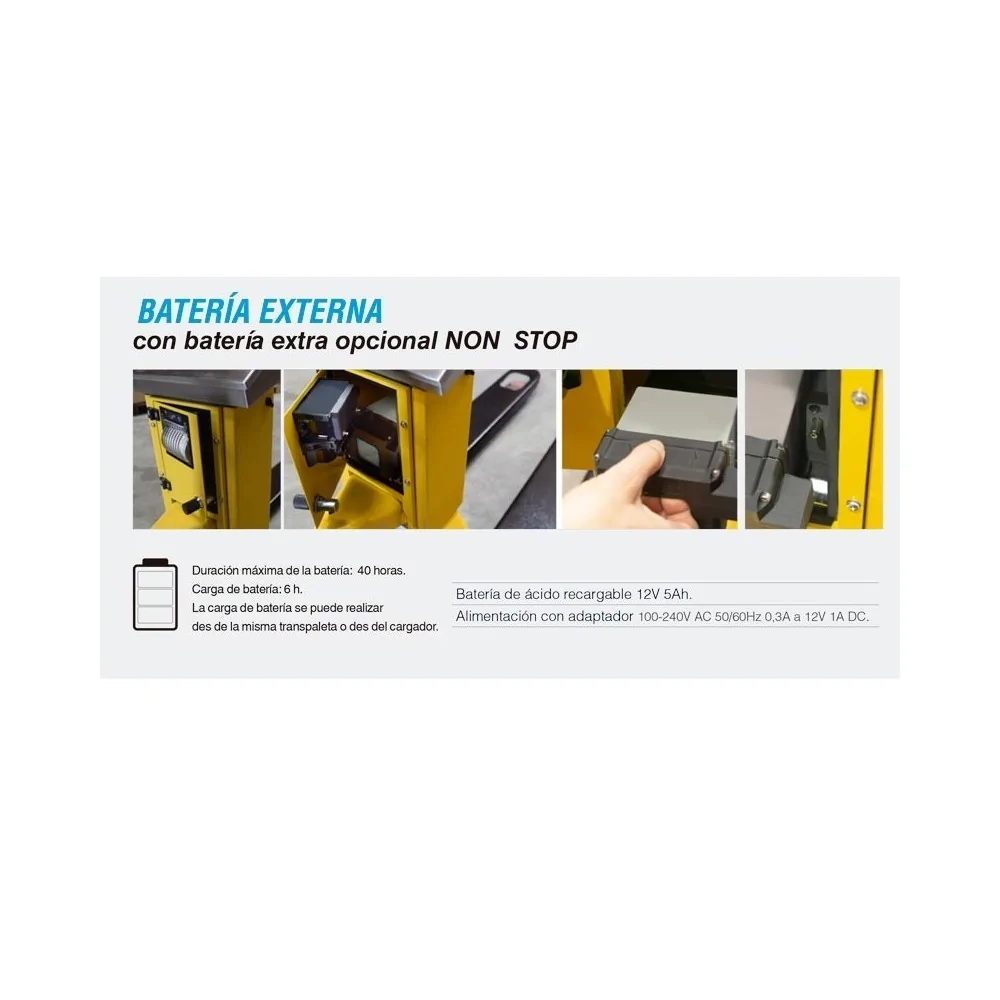 • La carga de batería se puede realizar desde la misma transpaleta o des del cargador.