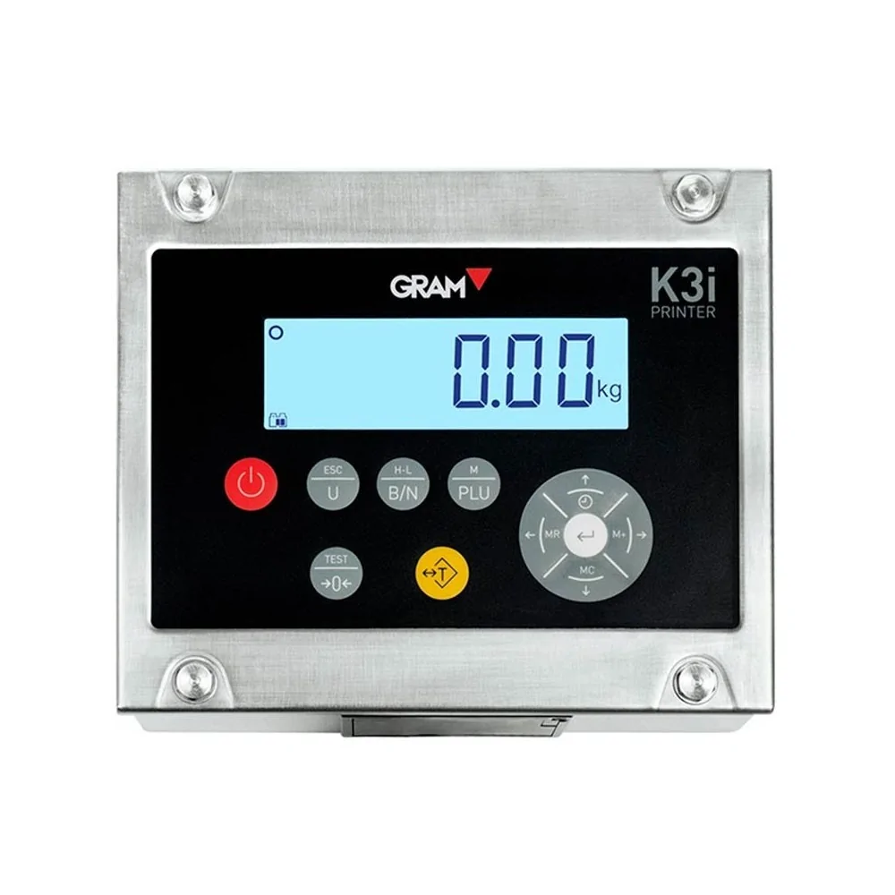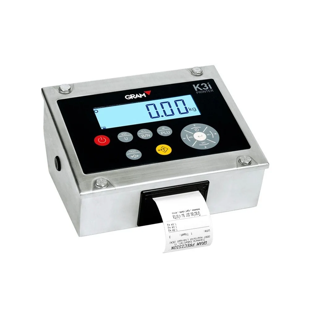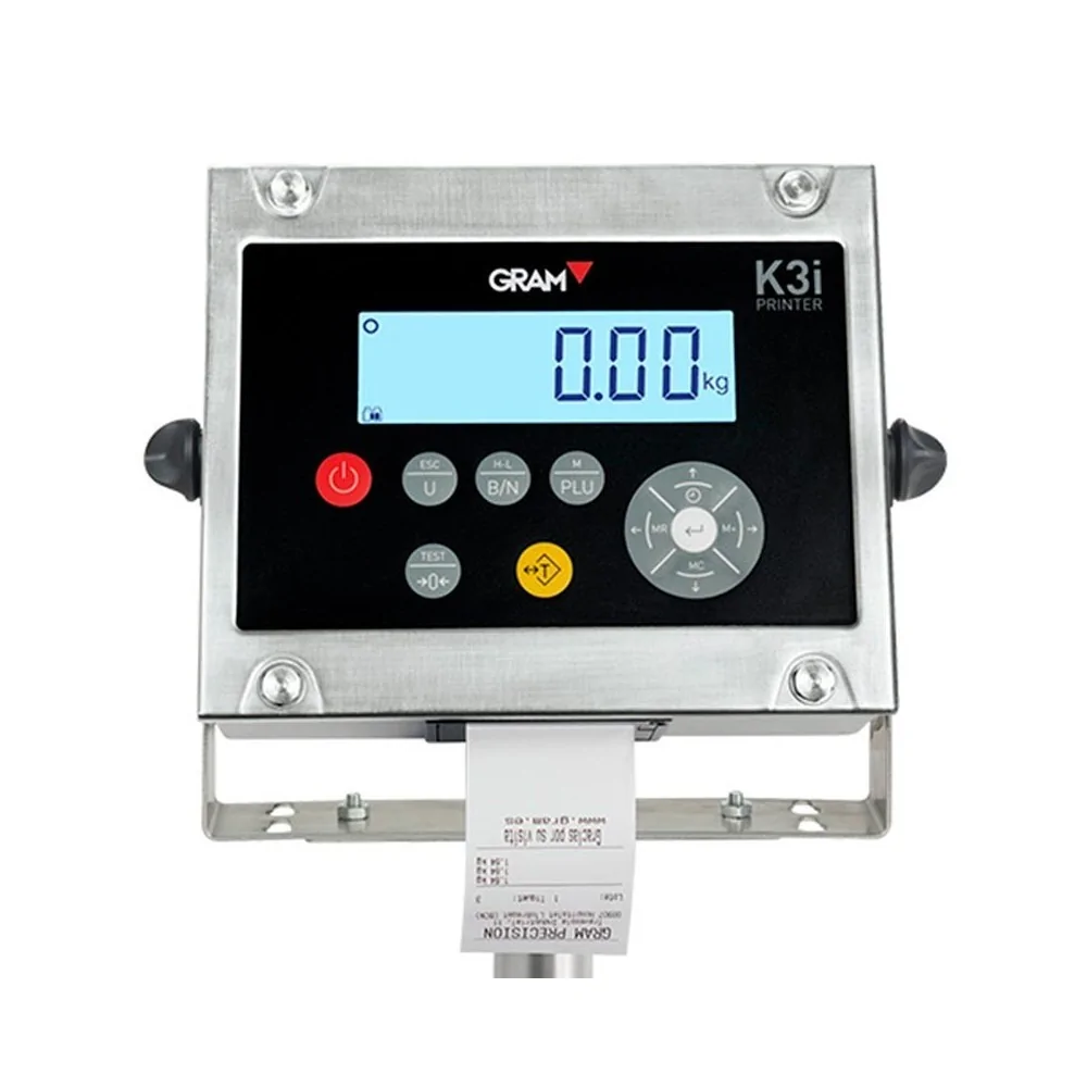El visor Gram K3i Printer es un visor fabricado en acero inoxidable que incluye una impresora térmica con la que obtener los datos de pesadas. posee entrada para escáner de código de barras.